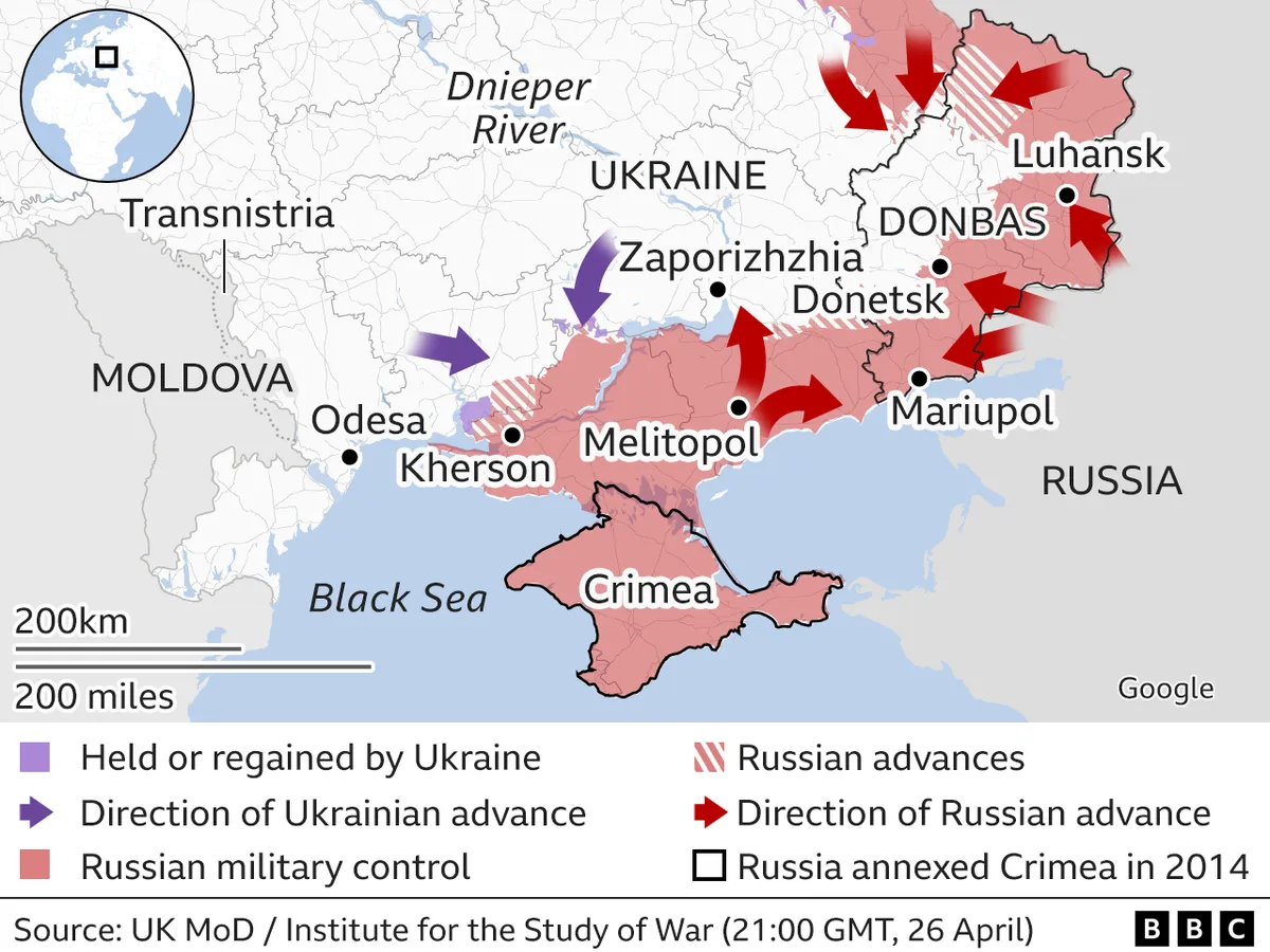 Dacă Rusia va întări Transnistria, s-ar putea să se deplaseze apoi către Odesa dinspre vest. Ofensiva rusă dinspre est a fost blocată de trupele ucrainene. Manevra ar devia forțele ucrainene, care și așa sunt destul de răsfirate.