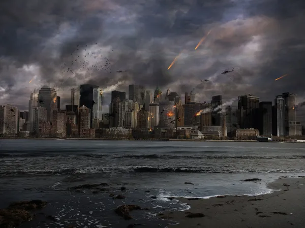 Sfere de foc uriașe sunt văzute coborând spre orașe în flăcări în ceea ce ar putea fi un atac nuclear.