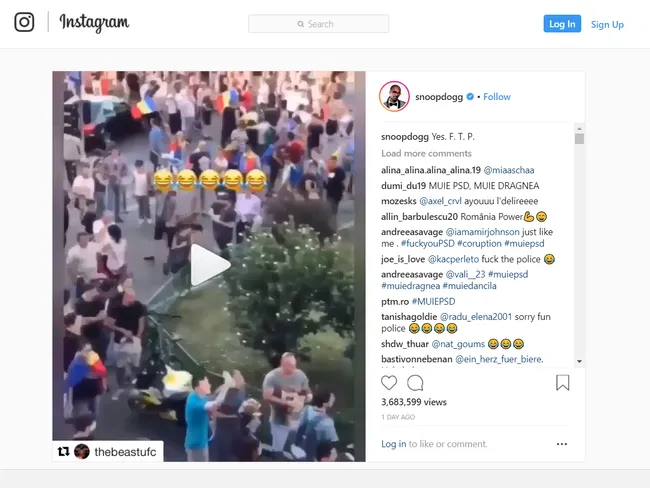O înregistrare de la protestele de vineri din Bucureșlti a fost postată pe contul de Instagram de celebrul rapper Snoop Dogg.