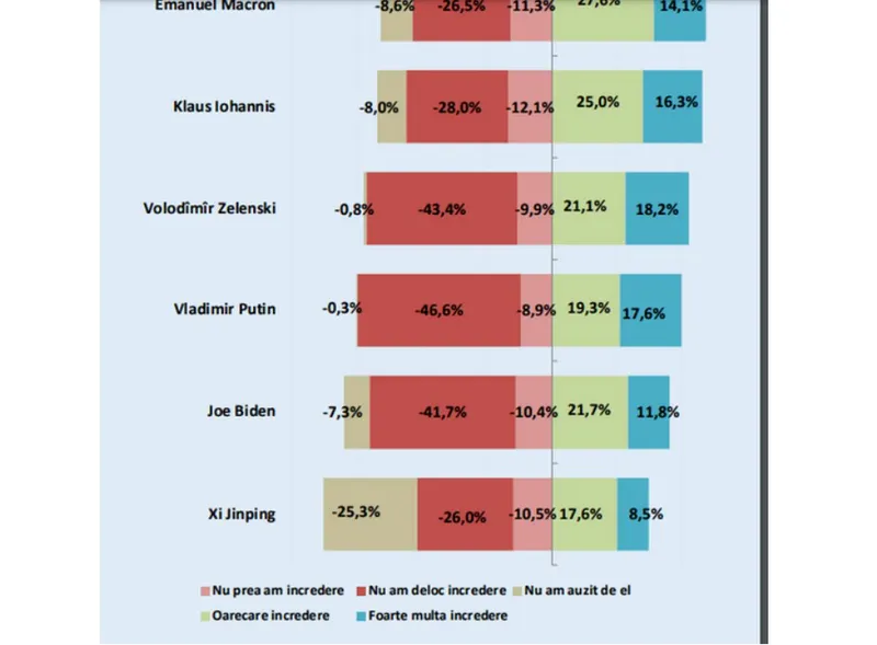 Opt la sută dintre cei chestionaţi declară că nu au auzit de Klaus Iohannis, în timp ce 8, 6% spun că nu au auzit de Emmanuel Macron, iar 7,3% nu ştiu cine este Joe Biden, 0,8% nu ştiu cine este Volodimir Zelenski, şi doar 0,3% nu au auzit de Vladimir Putin. Totuşi, cei mai numeroşi sunt cei care nu au auzit de Xi Jinping - 25,3%.