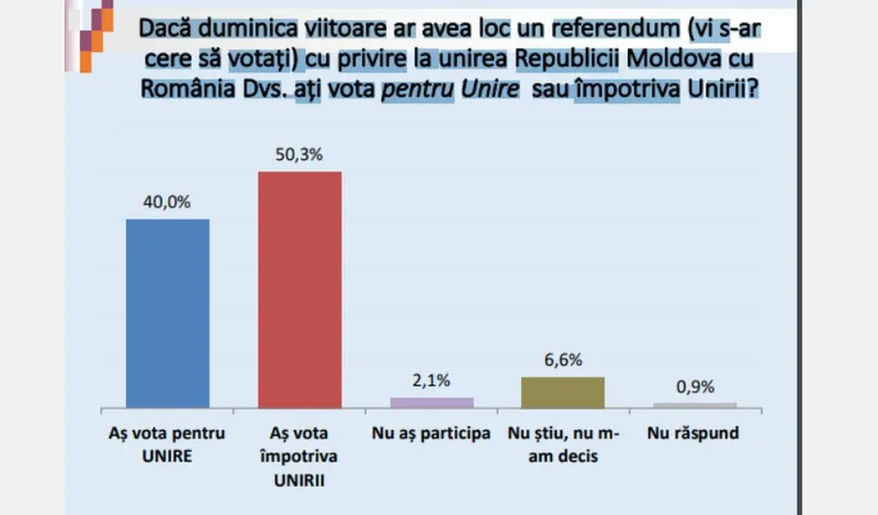 La întrebarea ”Dacă duminica viitoare ar avea loc un referendum (vi s-ar cere să votaţi) cu privire la unirea Republicii Moldova cu România Dvs. aţi vota pentru Unire sau împotriva Unirii?”, 40% au răspuns că ar vota pentru unire, în timp ce 50,3% au declarat că ar vota împotrivă.