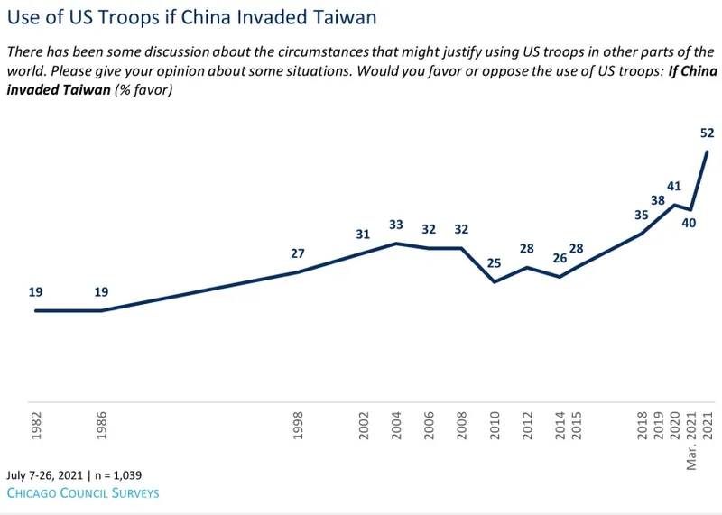Când sunt întrebați despre o serie de scenarii potențiale, puțin peste jumătate dintre americani (52%) sunt în favoarea utilizării trupelor pentru a apăra insula, dacă China ar invada-o. Acesta este cel mai înalt nivel înregistrat vreodată în sondajele Consiliului, sondaje care datează din 1982, când a fost pusă prima dată această întrebare.