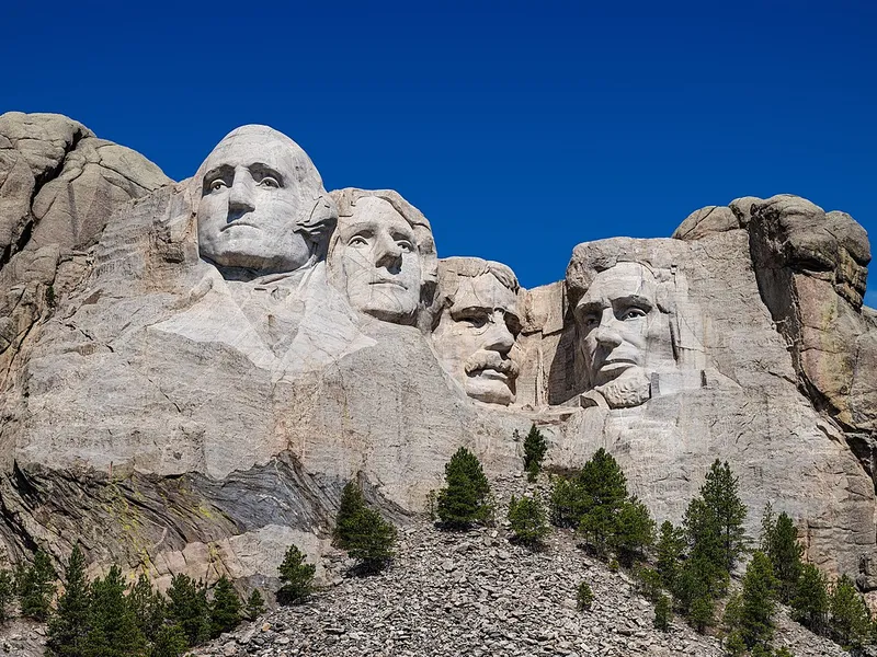 Pe Mount Rushmore sunt sculptate chipurile preşedinţilor George Washington, Thomas Jefferson, Abraham Lincoln şi Theodore Roosevelt.