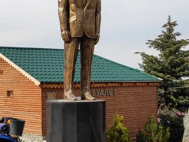 Cu o înălțime de aproximativ 2,5 metri înălțime, versiunea de bronz a președintelui rus poartă costum și cravată și privește spre munții acoperiți de zăpadă, relatează un site local, 24.kg.