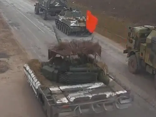 Trupele rusești au ridicat un steag de mari dimensiuni în cadrul unei acțiuni de propagandă înscenate în Khersonul ocupat, arată înregistrările video publicate marți. Videoclipurile de propagandă publicate miercuri de separatiștii susținuți de Rusia în Kreminna arată trupe care fixează steagul victoriei pe o clădire guvernamentală ucraineană.