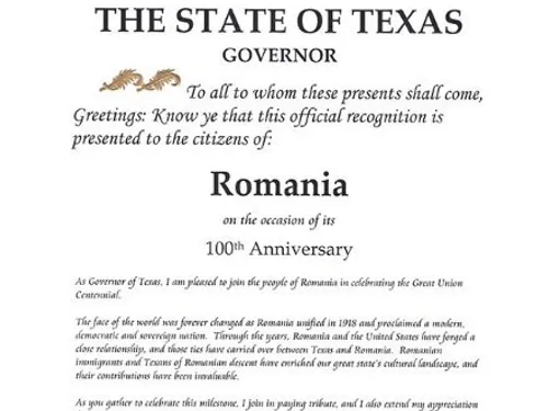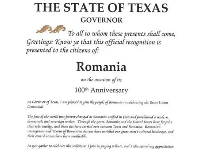 Guvernatorul statului Texas, Greg Abbott, a emis o proclamaţie oficială dedicată României, cu ocazia sărbătoririi Centenarului Marii Uniri de la 1918.