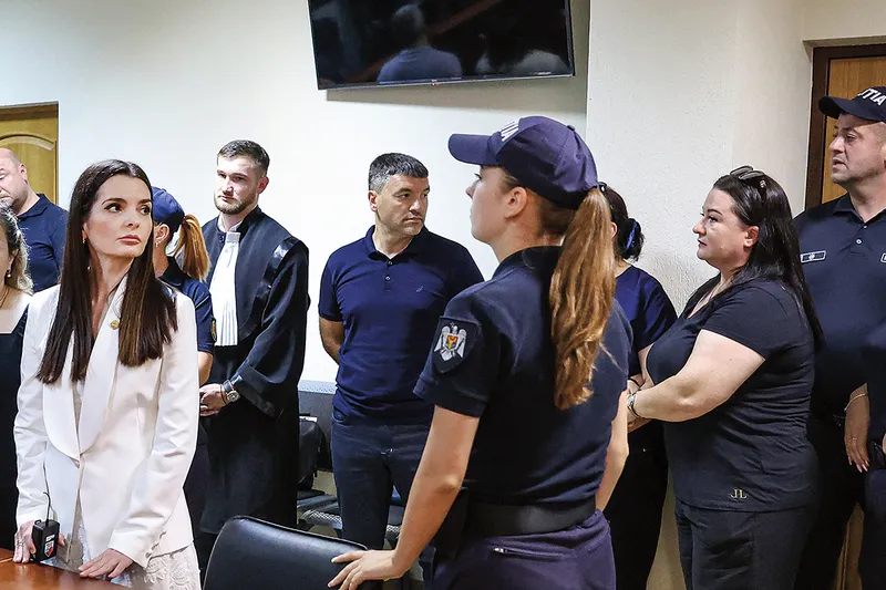 Guvernatoarea pro-rusă a regiunii Găgăuzia, Evghenia Guțul (stânga), privește ofițerii de poliție care intră în instanță pentru a o duce la închisoare, după pronunțarea sentinței de 7 ani închisoare pentru finanțarea ilegală a campaniei electorale. (5 august 2025) - Foto: Profimedia Images