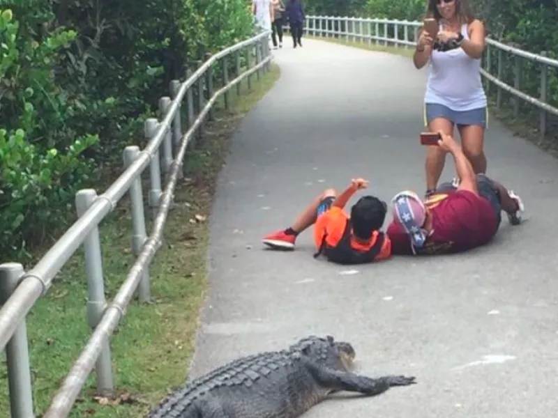 Tată și fiu la un pas să fie uciși de un aligator. O pereche de turiști care "în mod clar nu aveau nicio idee despre cât de repede se poate mișca un aligator" s-au întins în fața reptilei pentru un selfie, în timp ce reptila uriașă se apropia de ei din spate.