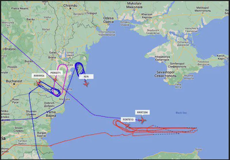 Miercuri, cerul de deasupra Mării Negre și din estul României era aglomerat de avioane de supraveghere ale NATO, printre care și un foarte rar Global Hawk, de 135.000.000 de dolari, care a zburat până în raza de acțiune a rușilor, la 100 de kilometri de coasta Rusiei.