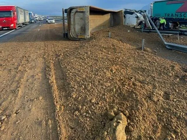 Trafic blocat complet pe autostrada A1 după ce un camion încărcat cu nisip s-a răsturnat pe șosea