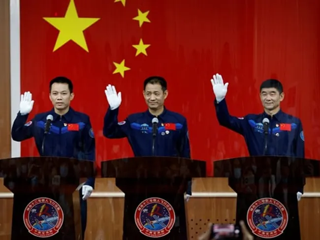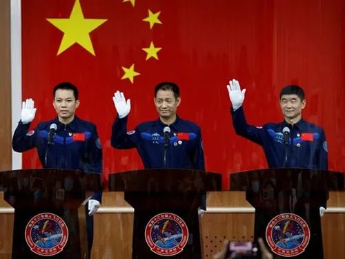 În timpul unei conferinţe de presă, organizată miercuri la Centrul pentru Lansări Spaţiale din Jiuquan, în deşertul Gobi (nord-vest), cei trei astronauţi au adresat un salut militar reporterilor, în faţa unui mare drapel roşu cu cinci stele.