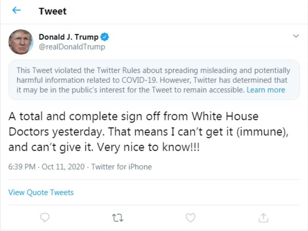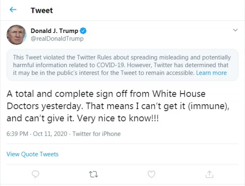 După mesajul publicat pe Twitter, purtătorul de cuvânt al companiei a transmis că ”acest mesaj a incălcat toate regulile Twitter cu privire la răspândirea informaţiilor false despre COVID-19”.