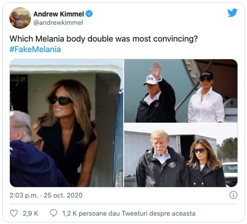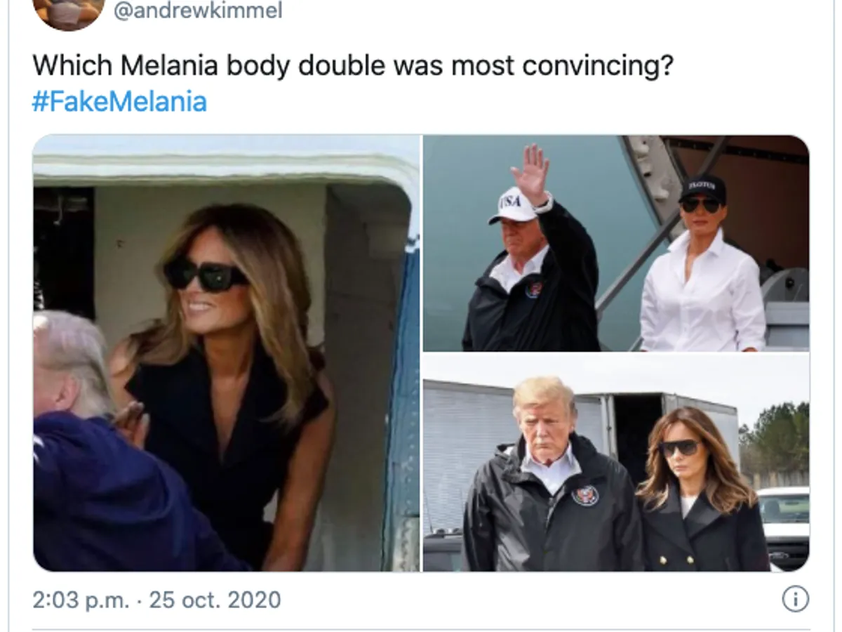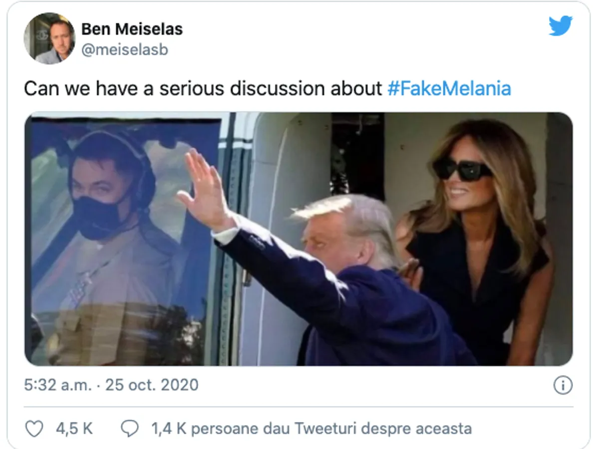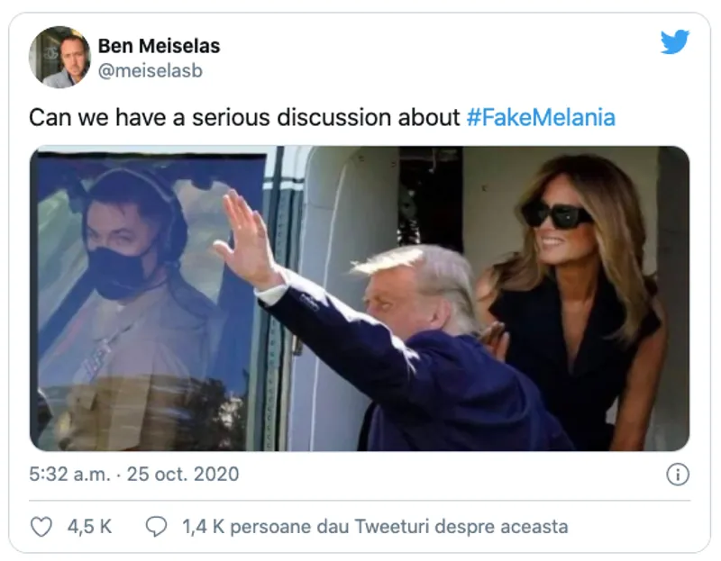 Hashtag-ul #FakeMelania a început să fie în tendințe pe Twitter în acest weekend, după ce a apărut o imagine cu Melania Trump îmbarcându-se în Marine One pe peluza sudică a Casei Albe, pentru a participa la dezbaterea prezidențială din Nashville.