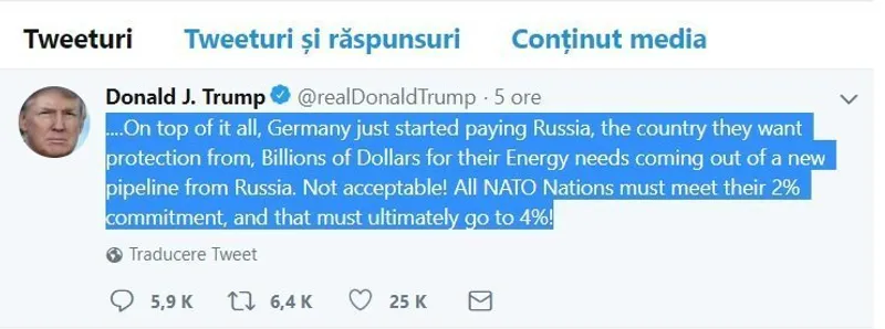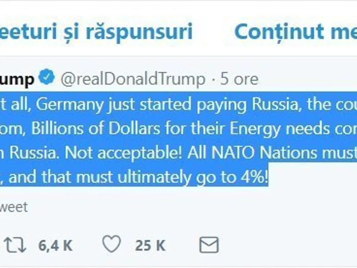 Potrivit Reuters, în cursul dimineții de joi, Donald Trump a criticat practicile comerciale ale țărilor din UE față de America și i-a acuzat din nou pe aliații din NATO că nu cheltuie suficient cu apărarea colectivă, solicitându-le să majoreze sumele alocate în cel mai scurt timp. Pe Twitter, liderul de la Casa Albă a apreciat că alocările bugetare ar trebui să ajungă în final la 4% din PIB.