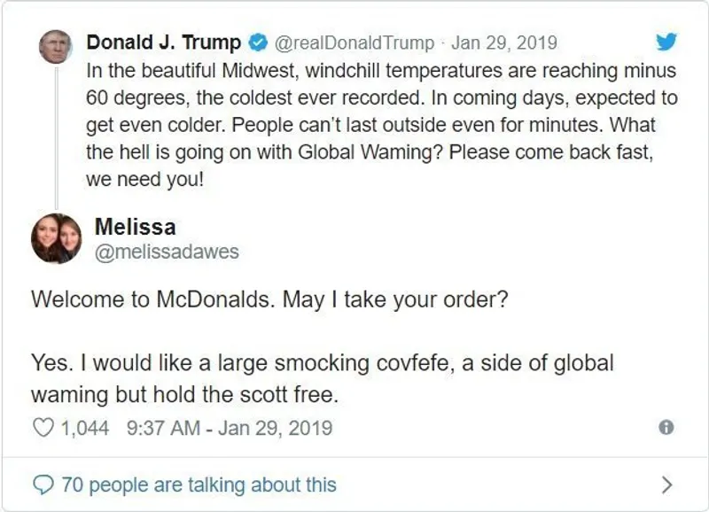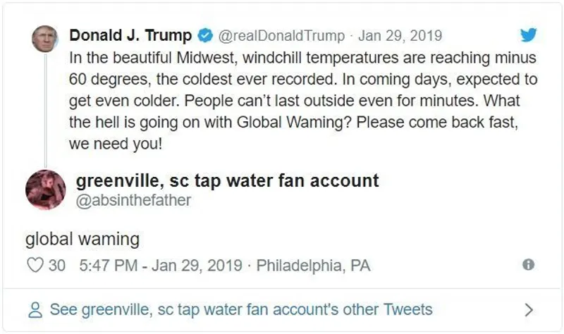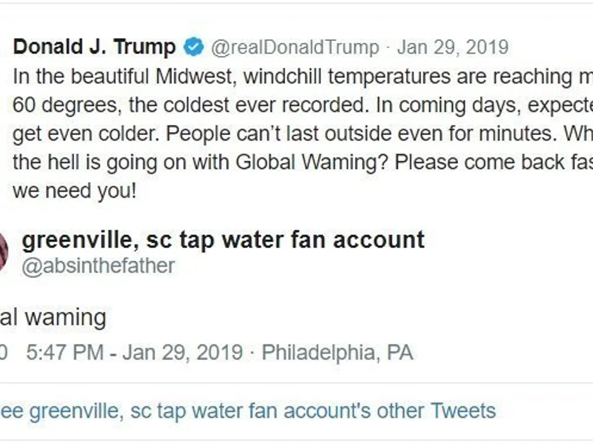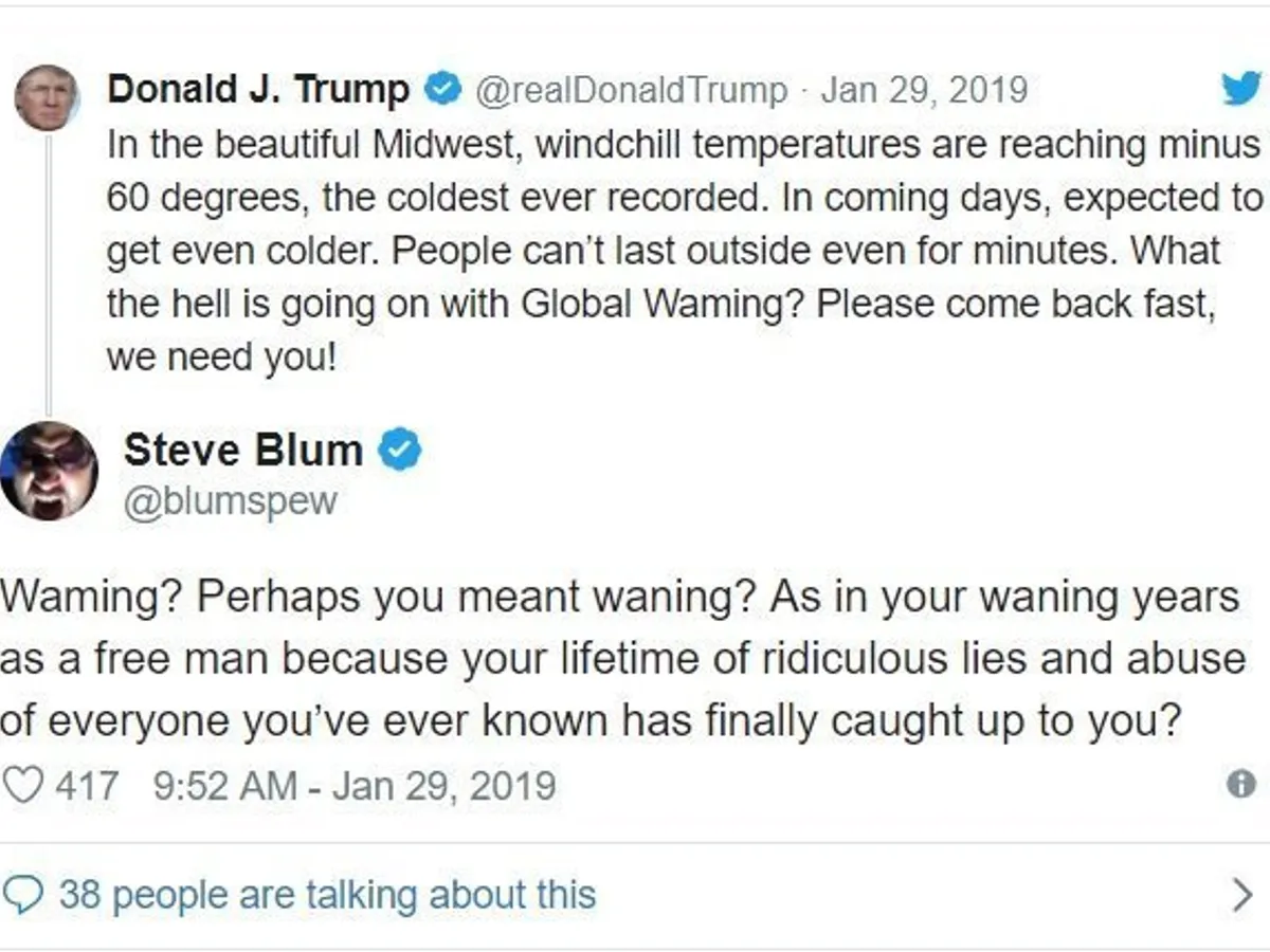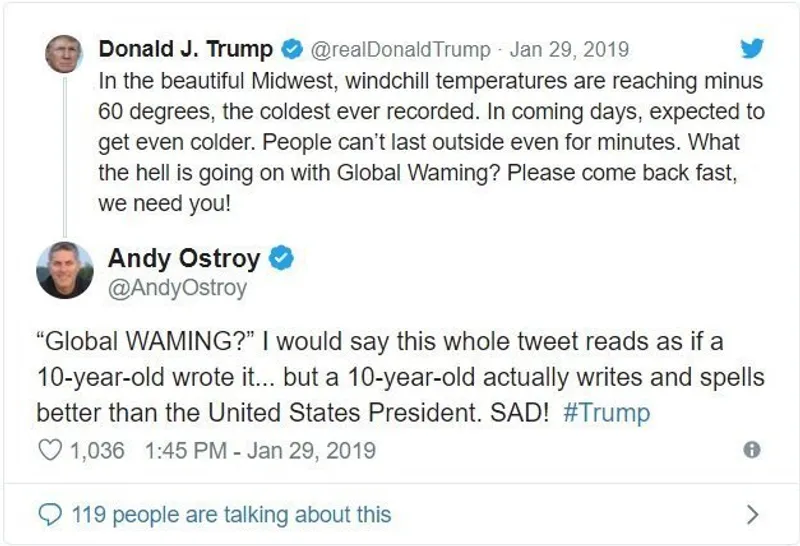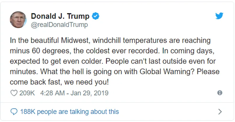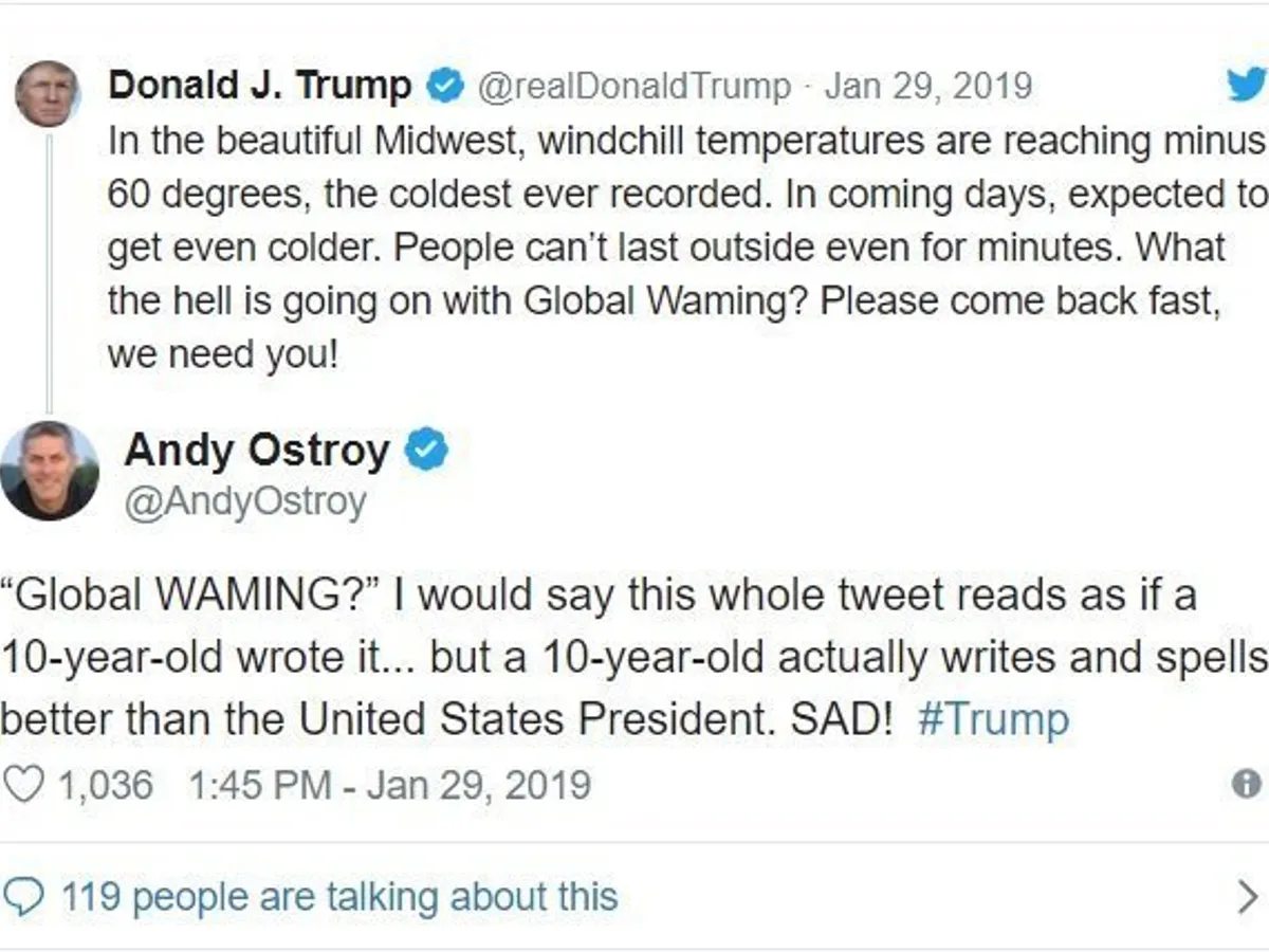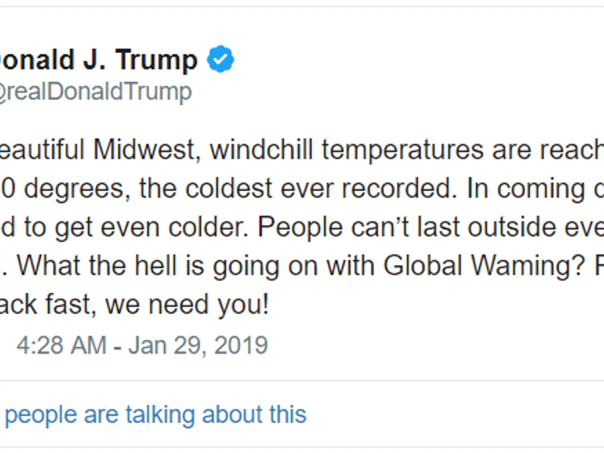 „În frumosul Midwest, temperatura vântului atinge minus 60 de grade, cea mai rece înregistrată vreodată. În zilele următoare, se așteaptă să devină și mai rece. Oamenii nu pot supraviețui afară chiar și pentru câteva minute. Ce naiba se întâmplă cu încălzirea globală? O rugăm să vină repede, avem nevoie de tine!", a postat Trump pe twitter, care a scris greșit cuvântul „warming”.