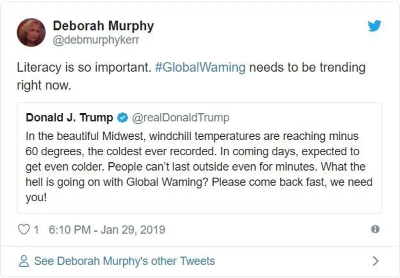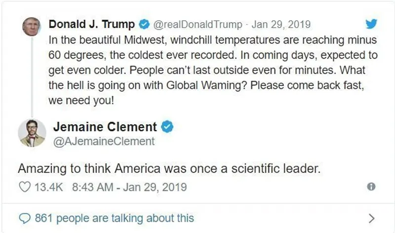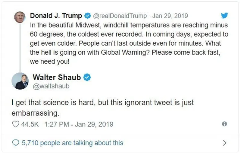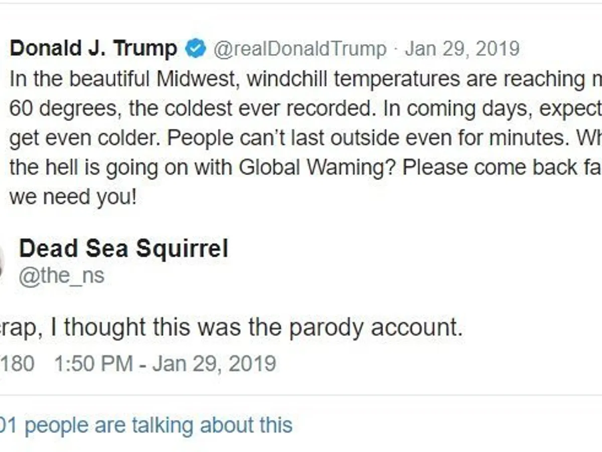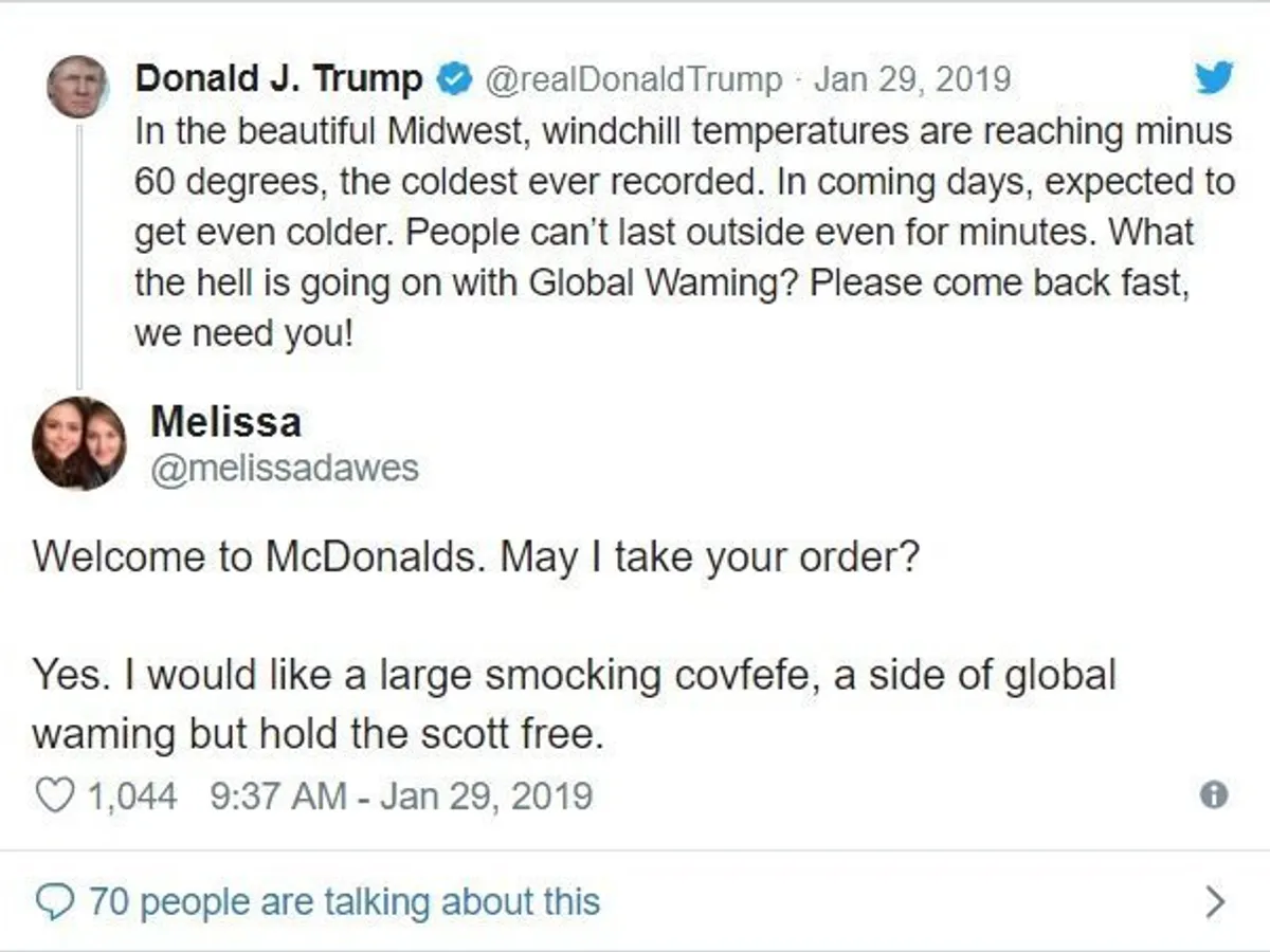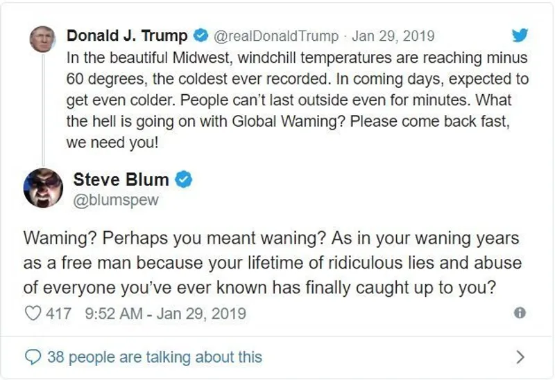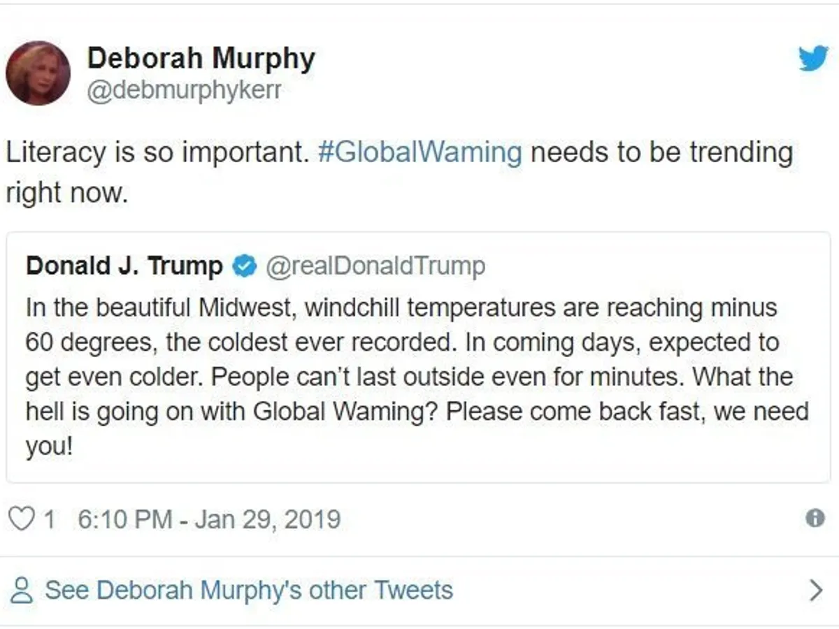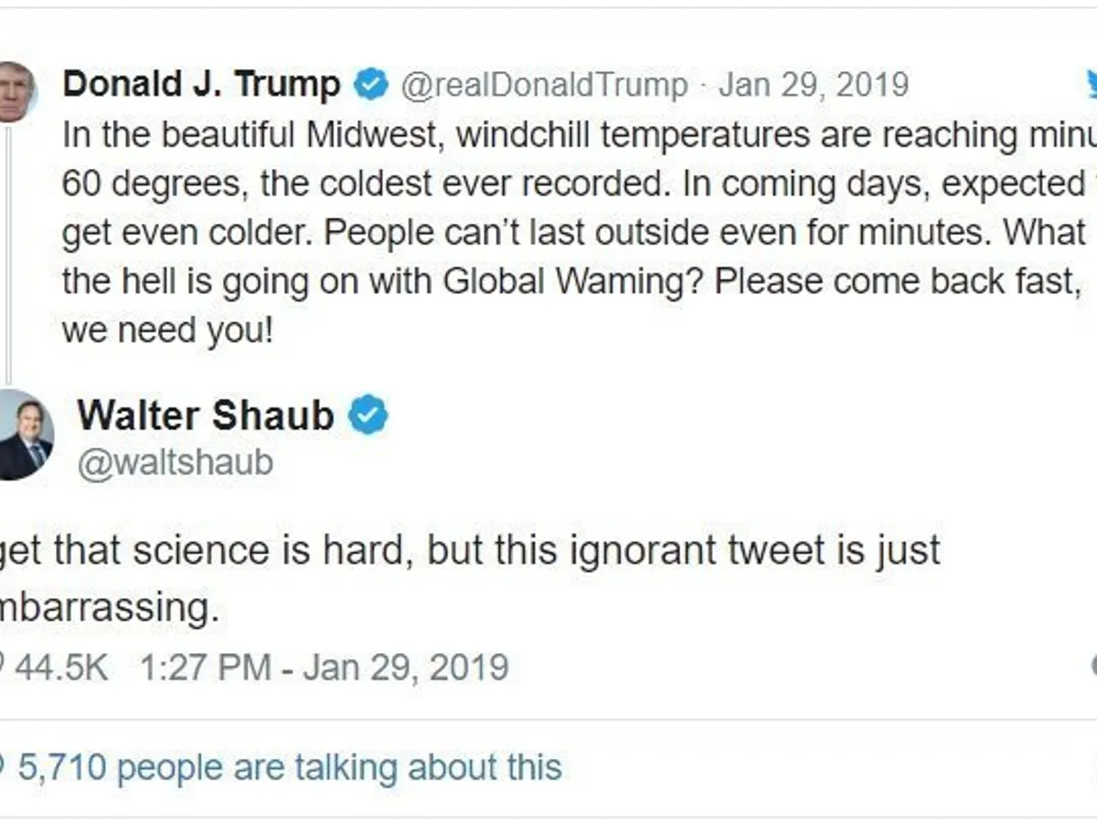 „În frumosul Midwest, temperatura vântului atinge minus 60 de grade, cea mai rece înregistrată vreodată. În zilele următoare, se așteaptă să devină și mai rece. Oamenii nu pot supraviețui afară chiar și pentru câteva minute. Ce naiba se întâmplă cu încălzirea globală? O rugăm să vină repede, avem nevoie de tine!", a postat Trump pe twitter, care a scris greșit cuvântul „warming”.