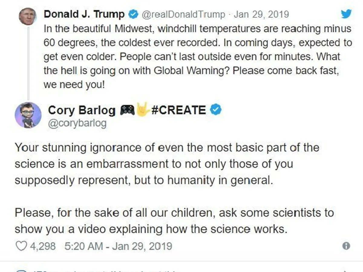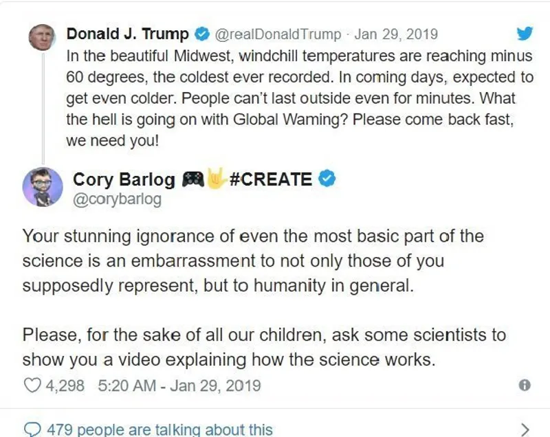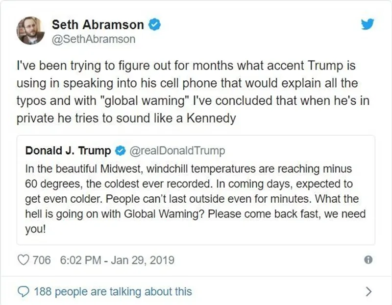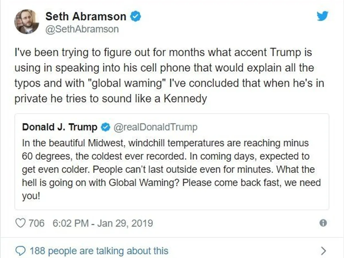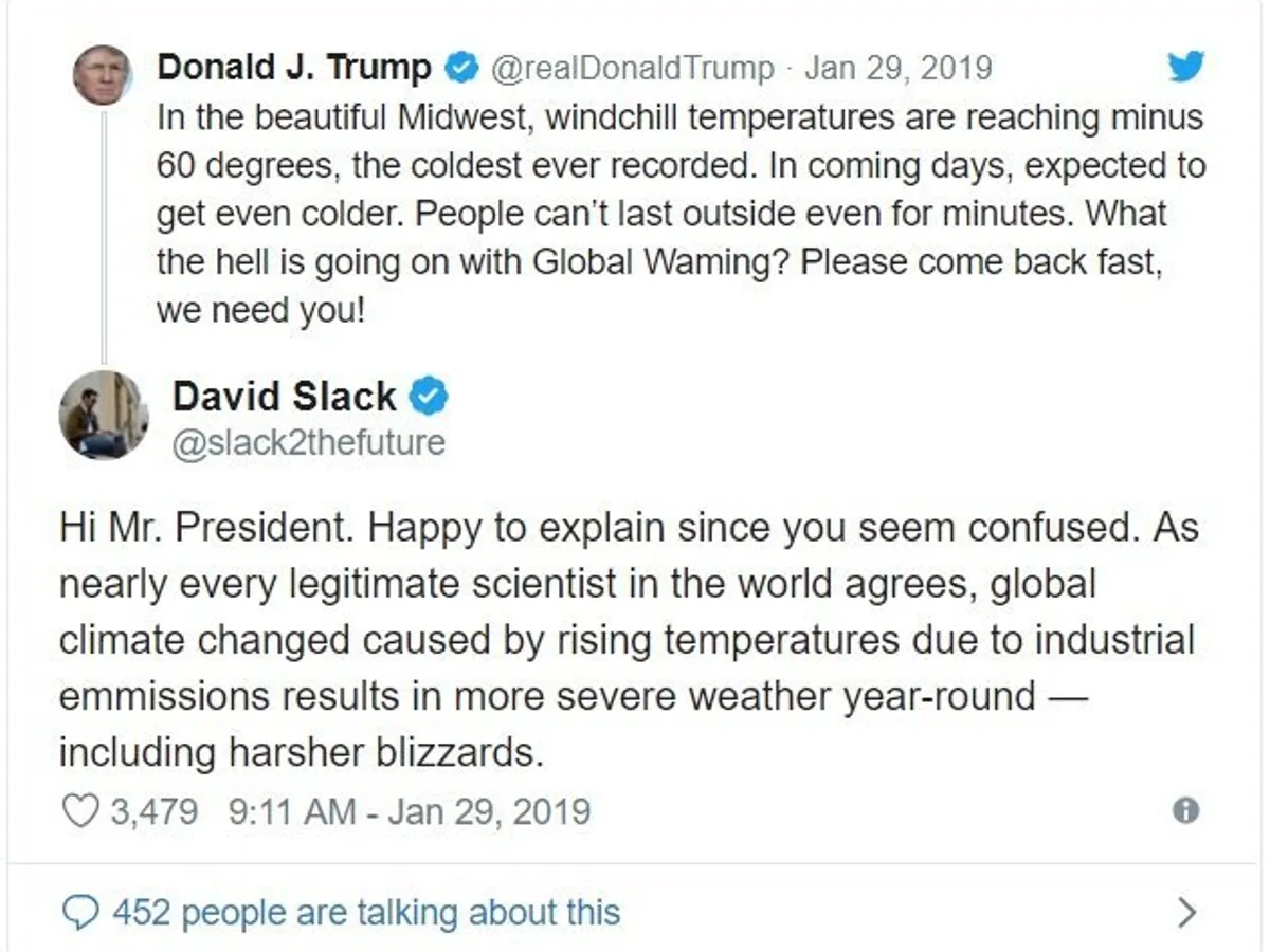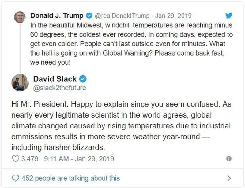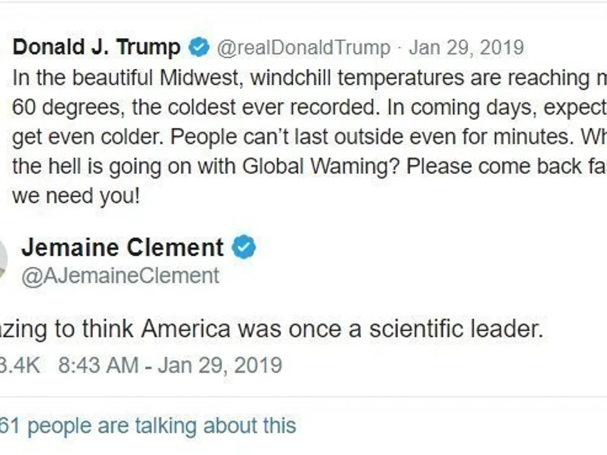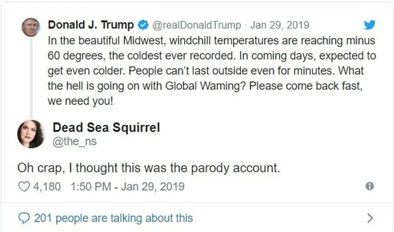 „În frumosul Midwest, temperatura vântului atinge minus 60 de grade, cea mai rece înregistrată vreodată. În zilele următoare, se așteaptă să devină și mai rece. Oamenii nu pot supraviețui afară chiar și pentru câteva minute. Ce naiba se întâmplă cu încălzirea globală? O rugăm să vină repede, avem nevoie de tine!", a postat Trump pe twitter, care a scris greșit cuvântul „warming”.