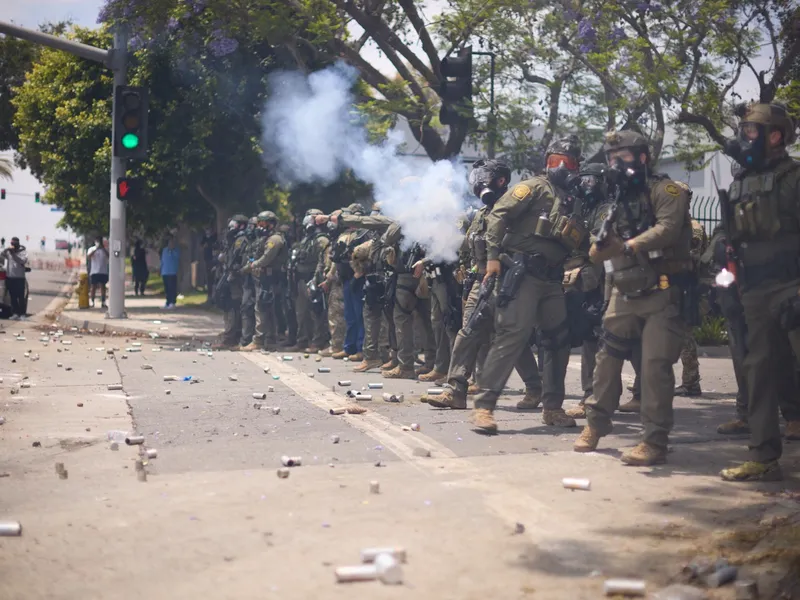 Imaginile distribuite sâmbătă pe X de șeful poliției de frontieră Michael Banks și transmise de Stephen Miller, un consilier apropiat al lui Donald Trump, au arătat zeci de agenți în uniforme militare kaki, înarmați și echipați cu măști de gaz, confruntându-se cu protestatari.