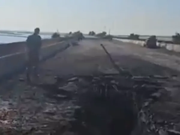 O serie de fotografii și videoclipuri care circulă pe Telegram arată un crater imens pe podul Chongar care leagă părțile controlate de Rusia din regiunea Herson de peninsula Crimeea, după un presupus atac al forțelor ucrainene cu rachete Storm Shadow, pe care Marea Britanie a confirmat că le-a furnizat Ucrainei luna trecută.