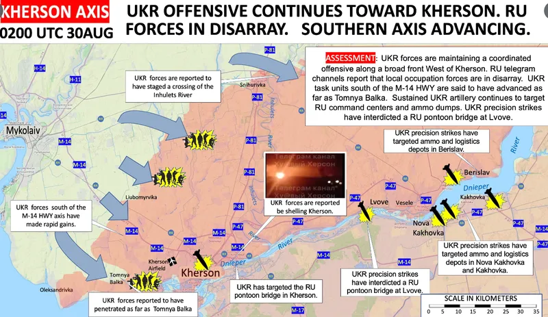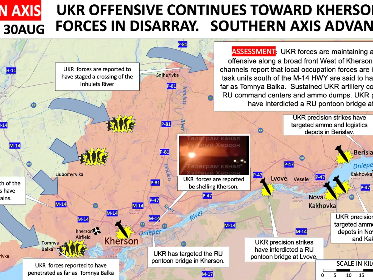 Pe de altă parte, jurnalistul militar ucrainean Ilia Pomarenko, care în urmă cu o zi îndemna la prudență privind relatările despre amploarea ofensivei ucrainene, afirmă marți dimineața că cel mai clar indiciu privind evoluția luptelor este faptul că Kremlinul se comportă de parcă nimic nu se întâmplă în sudul Ucrainei în timp ce bloggerii militari ruși fierb: Ei fie se comportă ca și cum totul este bine, fie sunt speriați de evoluția situației din Herson.