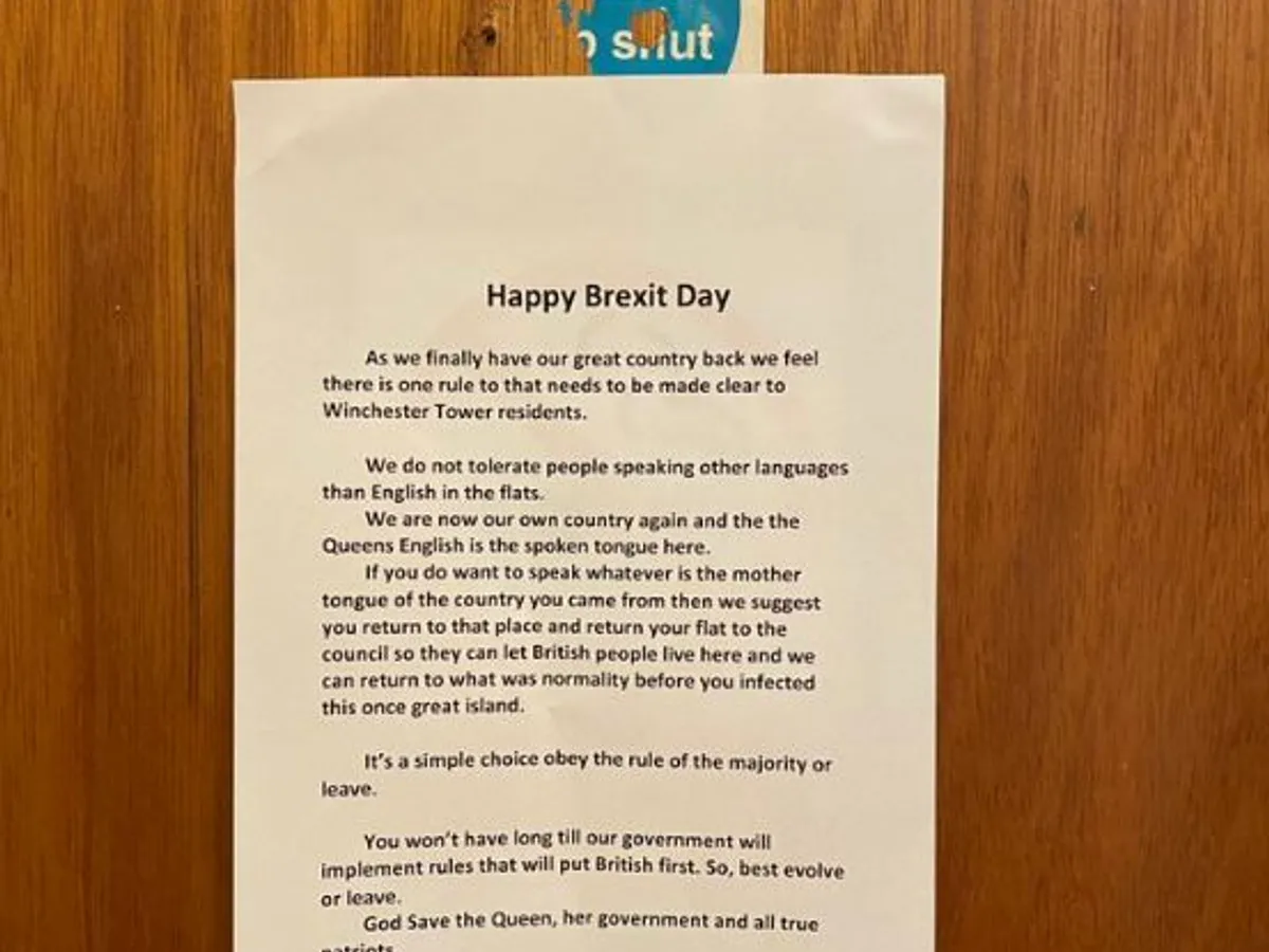 Pe afiș scria: „Întrucât avem în sfârșit marea noastră țară înapoi, există o singură regulă în Winchester Tower care trebuie să fie clară pentru rezidenți. Nu tolerăm oamenii care vorbesc alte limbi decât engleza în apartamente. Acum avem din nou țara noastră, iar limba engleză, a reginei, este limba vorbită aici. Dacă vreți să vorbiți limba maternă din oricare ar fi țara de unde ați venit vă sugerăm să vă întoarceți în locul acela și să returnați apartamentele consiliului, ca să poată fi repartizate englezilor și să ne întoarcem la normalitatea de dinainte ca voi să infectați această insulă cândva măreață. Este o alegere simplă, respectați regula majorității sau plecați.Nu va mai dura mult până ce guvernul nostru va implementa regulile care îi pun pe britanici în față. Deci, evoluați sau plecați. Dumnezeu să țină Regina, guvernul ei și pe adevărații patrioți.”