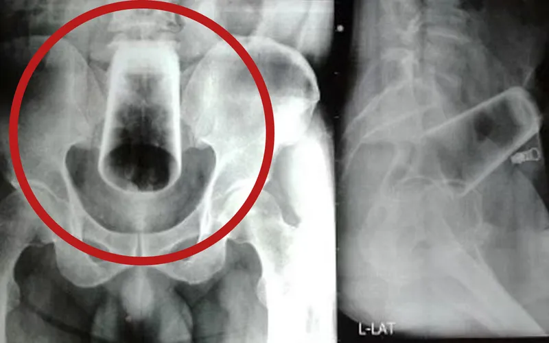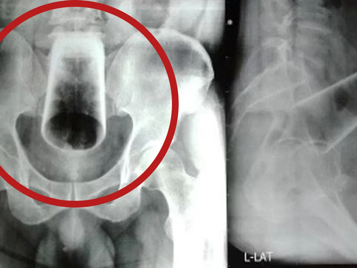 A încercat să scoată singur paharul, dar încercările sale au eșuat la fel ca și cele ale medicilor care, după ce i-au făcut o radiografie tipului, nu au reușit să prindă paharul care se deplasase în abdomenul său.
