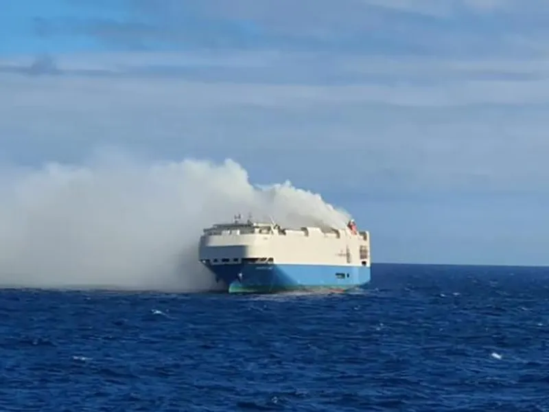 Un cargou plin cu mașini de lux a luat foc și plutește în derivă în mijlocul Atlanticului