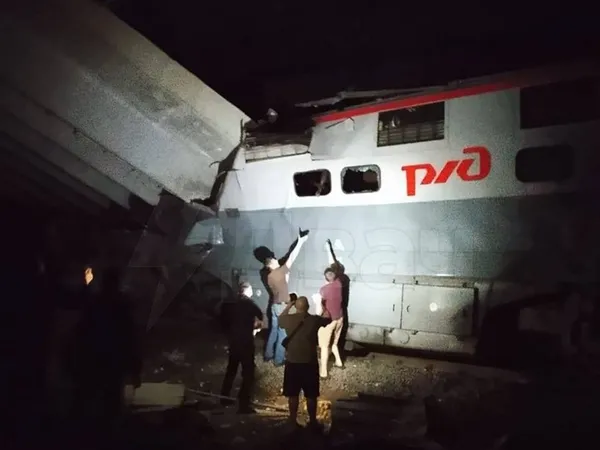 Locomotiva trenului şi mai multe vagoane au deraiat „din cauza prăbuşirii structurii unei porţiuni a unui pod rutier, cauzată de interferenţa ilegală în operaţiunile de transport”, a declarat Căile Ferate Ruse pe Telegram.