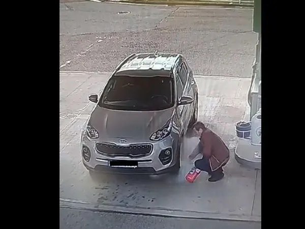 În imaginile surprinse de cameră se vede cum un SUV gri se apropie de o pompă, șoferul oprește și încearcă să umfle o anvelopă cu stingătorul de incendiu, notează Blesk.