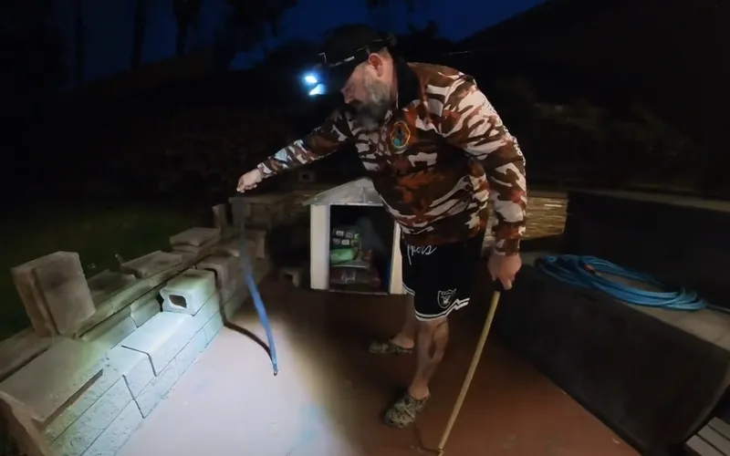 Youtuberul Colin Shoemark, care își câștigă existența prinzând șerpi, a fost chemat la casa cuiva după ce a fost găsit un șarpe negru cu burta roșie. Măsurând 1,80 metri lungime, acesta a fost găsit în spatele frigiderului - este cel mai des întâlnit șarpe veninos din Australia.