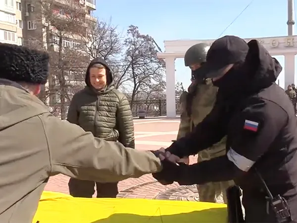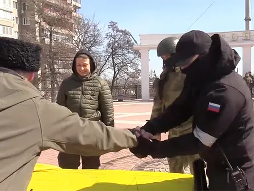 În videoclip, indivizi înarmați și trupe rusești sunt văzuți scriind pe un steag ucrainean în piața centrală din Melitopol. Un steag ucrainean de mari dimensiuni care flutura deasupra pieței a fost dat jos pe 14 martie.