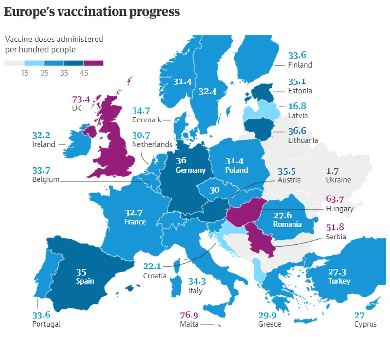 Rata de vaccinare în Europa, raportat la 100 de locuitori. Grafic The Guardian