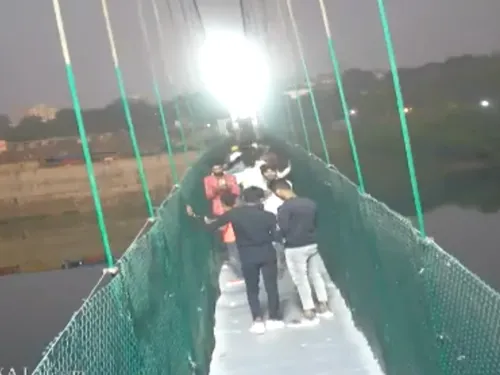 Conform informaţiilor furnizate de poliţia locală, 500 de persoane, inclusiv femei şi copii, participau la o sărbătoare religioasă pe şi în jurul podului în momentul în care cablurile care îl susţineau au cedat la scurt timp după lăsarea întunericului.