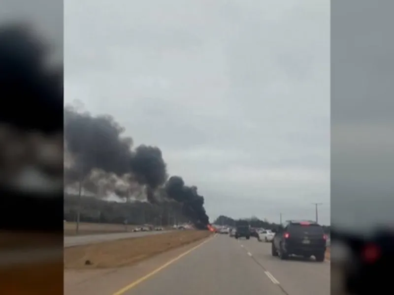 Înregistrările video realizate la fața locului arată o coloană groasă de fum negru care se ridică din ceea ce pare a fi un mijloc de autostradă.