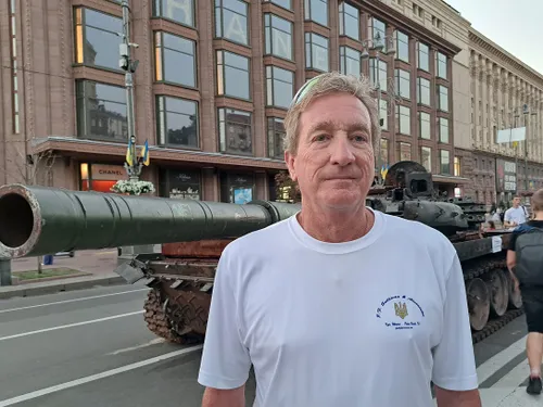 Cortespondență din Kiev: Pe John Sullivan l-am întâlnit în centrul Kievului, la „parada’ tancurilor rusești distruse sau capturate de către armata ucraineană după invadarea țării vecine de către Rusia lui Puțin, în 24 februarie 2022.