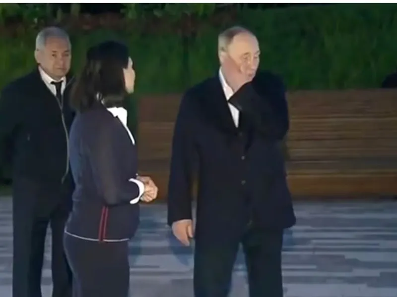 Șeful de la Kremlin este văzut vorbind cu Ksenia, fiica ministrului Apărării, Serghei Șoigu, când țânțarii încep să bâzâie în jurul părții drepte a feței sale.