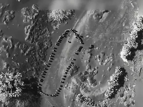 Imaginile, în alb-negru şi luate dintr-o vedere aeriană - ca şi cum ar fi fost filmate de o dronă militară - arată câteva zeci de persoane adunate într-un cerc, mai întâi în linia de foc, apoi bombardate.