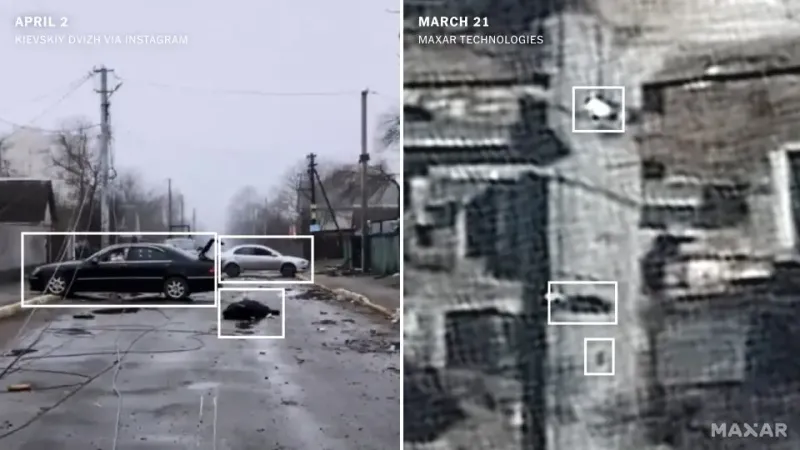 Pentru a confirma când au apărut cadavrele și când au fost probabil uciși civilii, echipa de investigații vizuale de la The Times a efectuat o analiză înainte și după a imaginilor din satelit. Imaginile arată obiecte întunecate de dimensiuni similare cu un corp uman apărute pe strada Iablonska în perioada 9 martie – 11 martie.