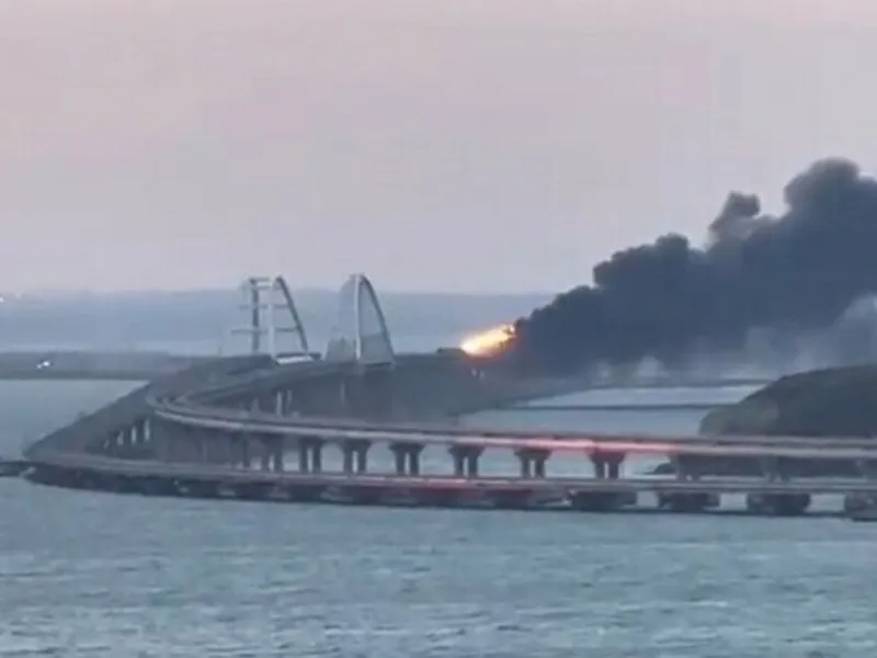 Podul Kerci peste strâmtoarea cu același nume, construit de Vladimir Putin după anexarea Crimeei în 2014, este în flăcări. Mai multe explozii l-au zguduit în această dimineață, la o zi după ce președintele rus a împlinit 70 de ani, după ce o cisternă cu combustibil a explodat.
