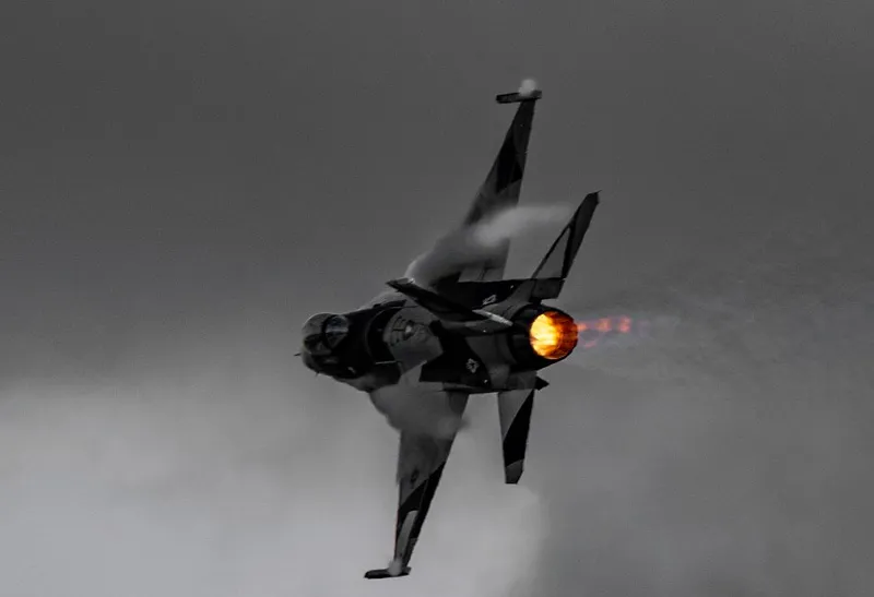 Printre imagini, se numără o vedere de sus, a unui avion de luptă F-16V al Forțelor Aeriene taiwaneze, echipat cu două rachete cu rază medie de acțiune AIM-120 și două rachete cu rază scurtă de acțiune AIM-9.