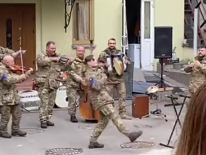 VIDEO Concert ad-hoc în centrul Kievului. Militarii ucraineni au dat armele pe instrumente muzicale