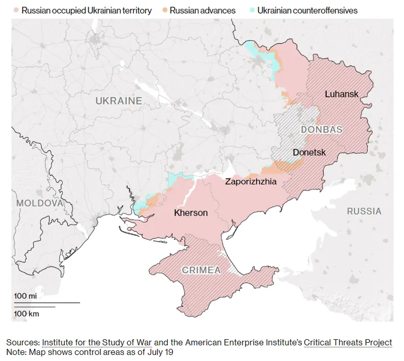 Capacitatea forțelor ucrainene de a anula câștigurile teritoriale ale Rusiei fără a primi mai mult armament de artilerie, vehicule blindate și sisteme antiaeriene de la națiunile aliate este, de asemenea, neclară. Deși Kievul a desfășurat numeroase contraofensive de când a început invazia pe 24 februarie, acestea au fost la scară mică.