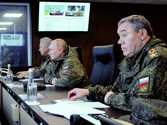 Agenția de știri militare Zvezda a publicat o înregistrare video în care Putin și generalul Valeri Gerasimov intră în cabina de comandă, se așează cu un spațiu larg între ei și păstrează o tăcere incomodă în timp ce așteaptă sosirea ministrului Apărării, Serghei Șoigu.