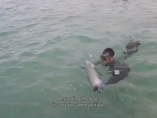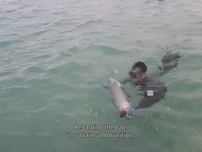În videoclip, ofițerii sunt, de asemenea, arătați scoțând din apă un focos de grenadă propulsată de rachetă (RPG) înainte de a-l detona în siguranță pe o plajă din Gaza.