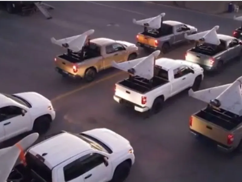 Filmările publicate surprind camionete, fiecare purtând lansator împreună cu o dronă kamikaze.