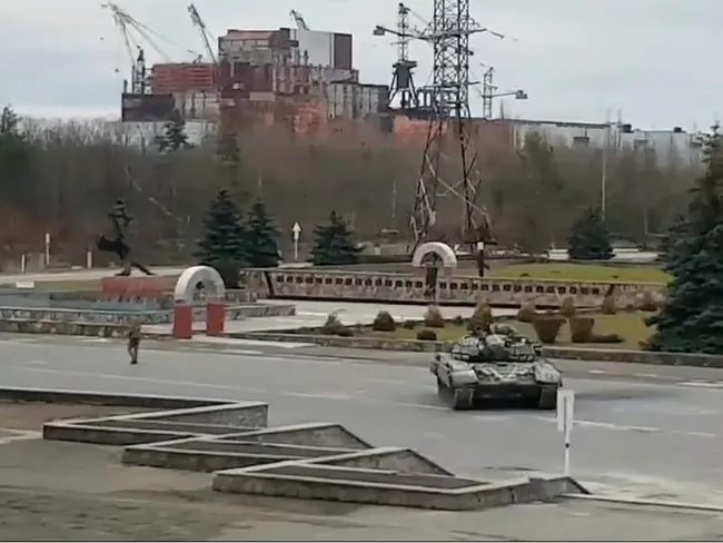 Un videoclip a dezvăluit tancuri rusești și vehicule blindate staționând în fața reactorului distrus, care se află la doar 90 de kilometri nord de capitala Kiev.