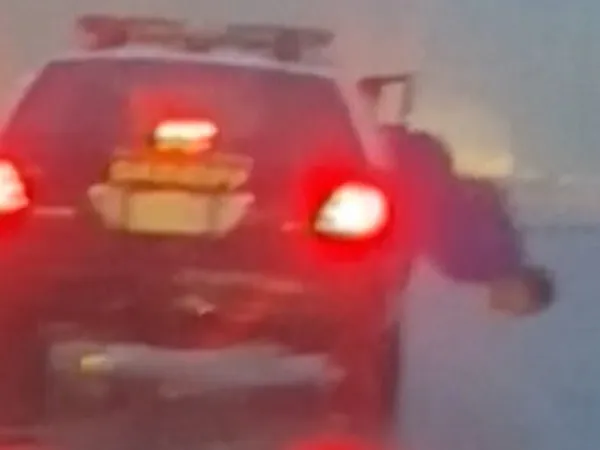 Înregistrarea video arată cum bărbatul se agață de partea laterală a mașinii de patrulare a șerifului, apoi alunecă din vehicul și ajunge pe autostradă.