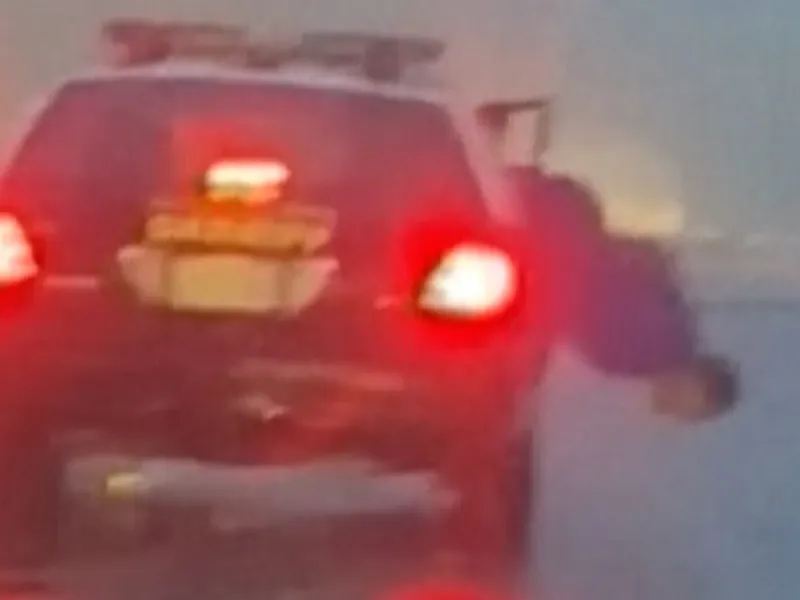 VIDEO Evadare dramatică: Un bărbat încătușat încearcă să iasă dintr-o mașină de poliție în mișcare