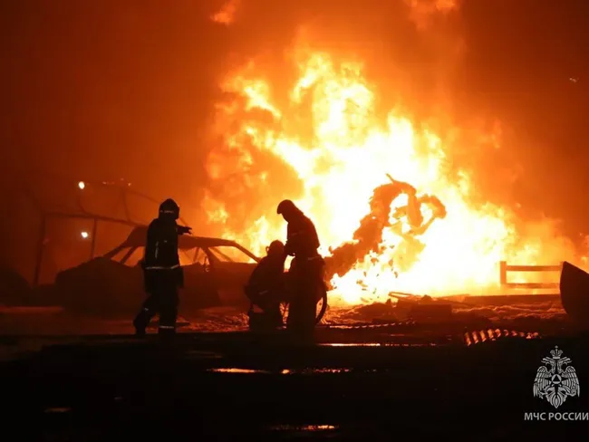 Într-o înregistrare video făcută publică de Ministerul rus pentru Situaţii de Urgenţă se poate vedea cum un grup de pompieri încearcă că stingă flăcările în apropierea carcaselor de autovehicule.