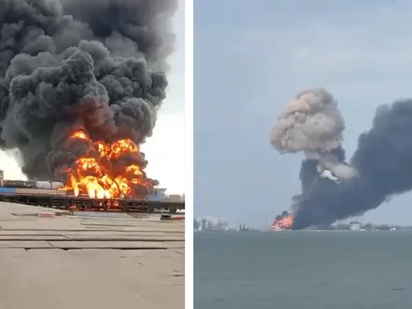 Ukraine hit with a missile ferry train loaded with 30 full tanks in the port of "Kavkaz" near the Criema bridge